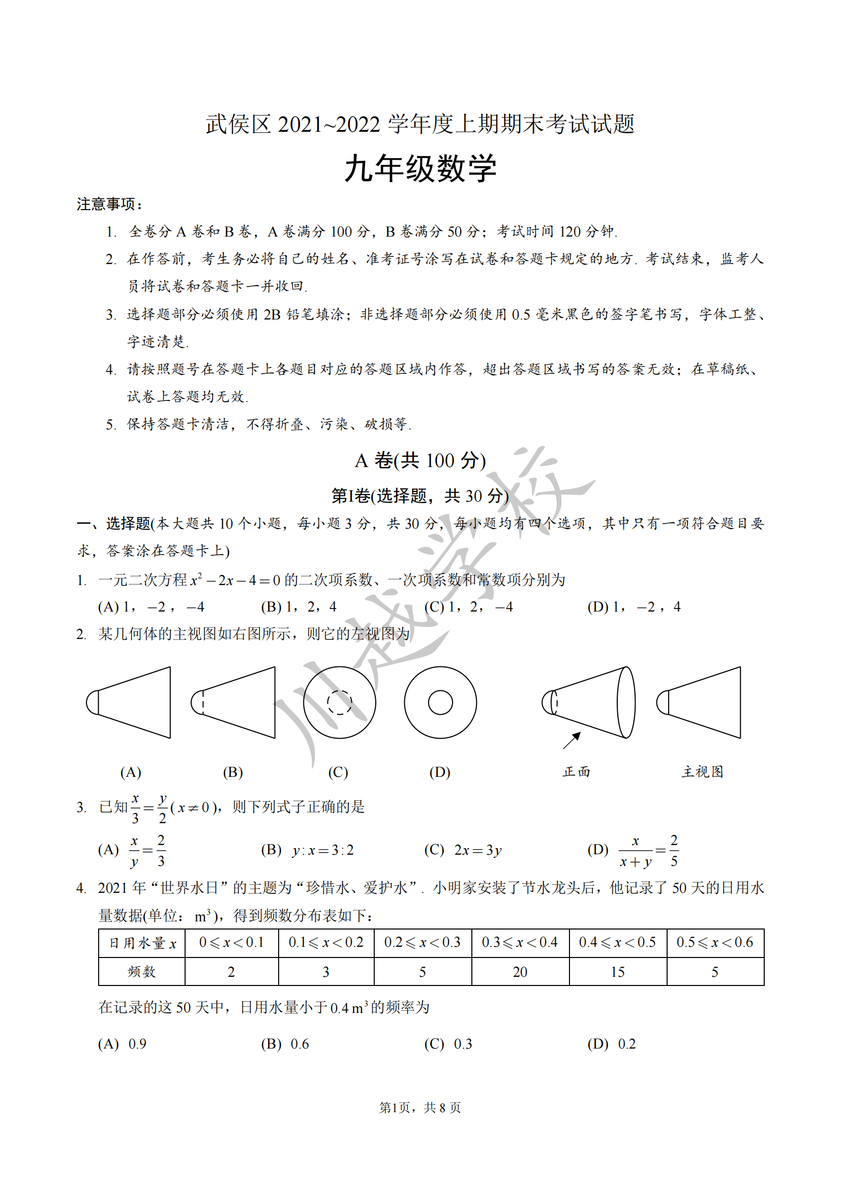2022年武侯區(qū)九年級(jí)數(shù)學(xué)上期末試卷及參考答案