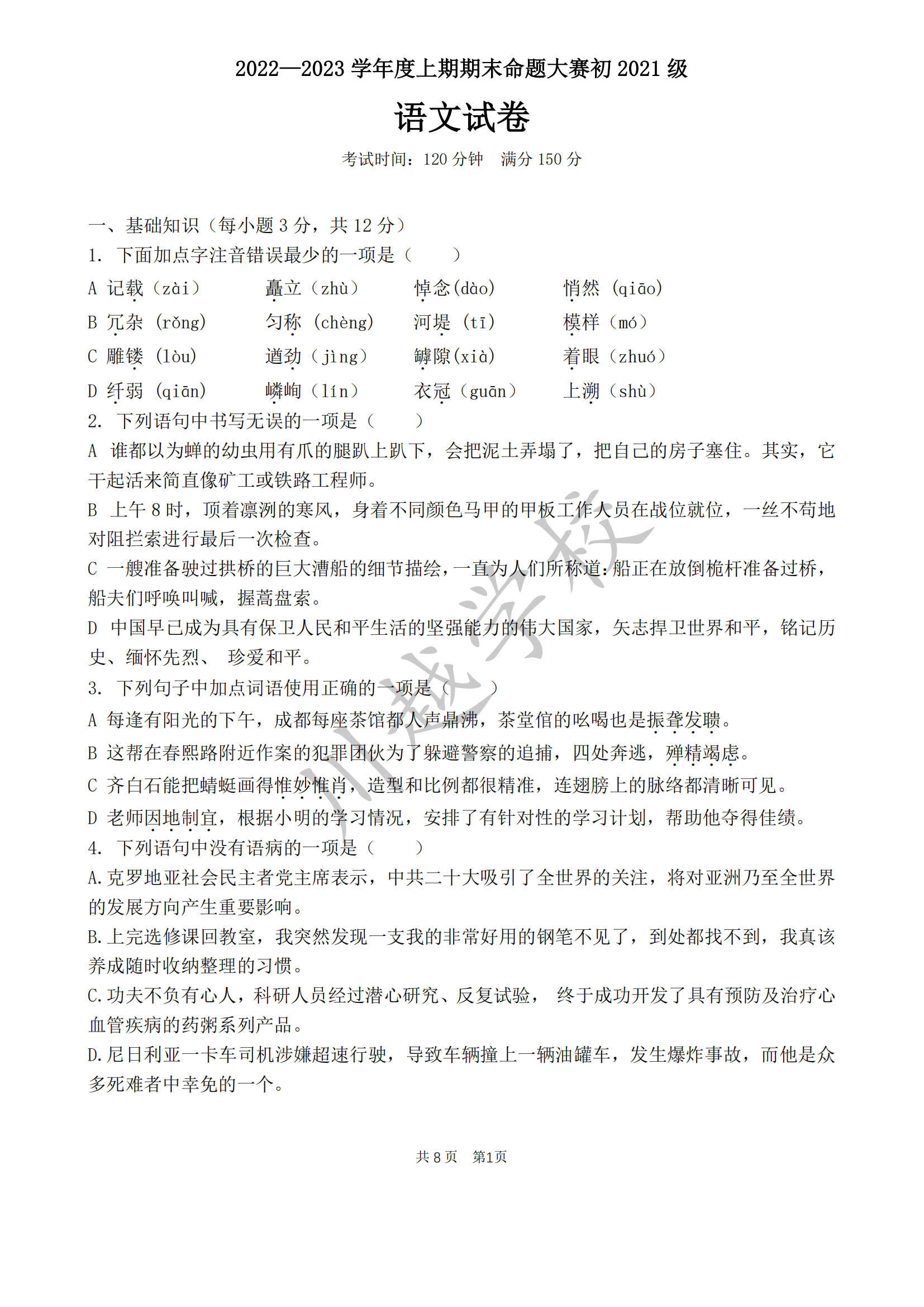 四川省成都七中八一學(xué)校2022-2023學(xué)年八年級上學(xué)期12月期末語文試題