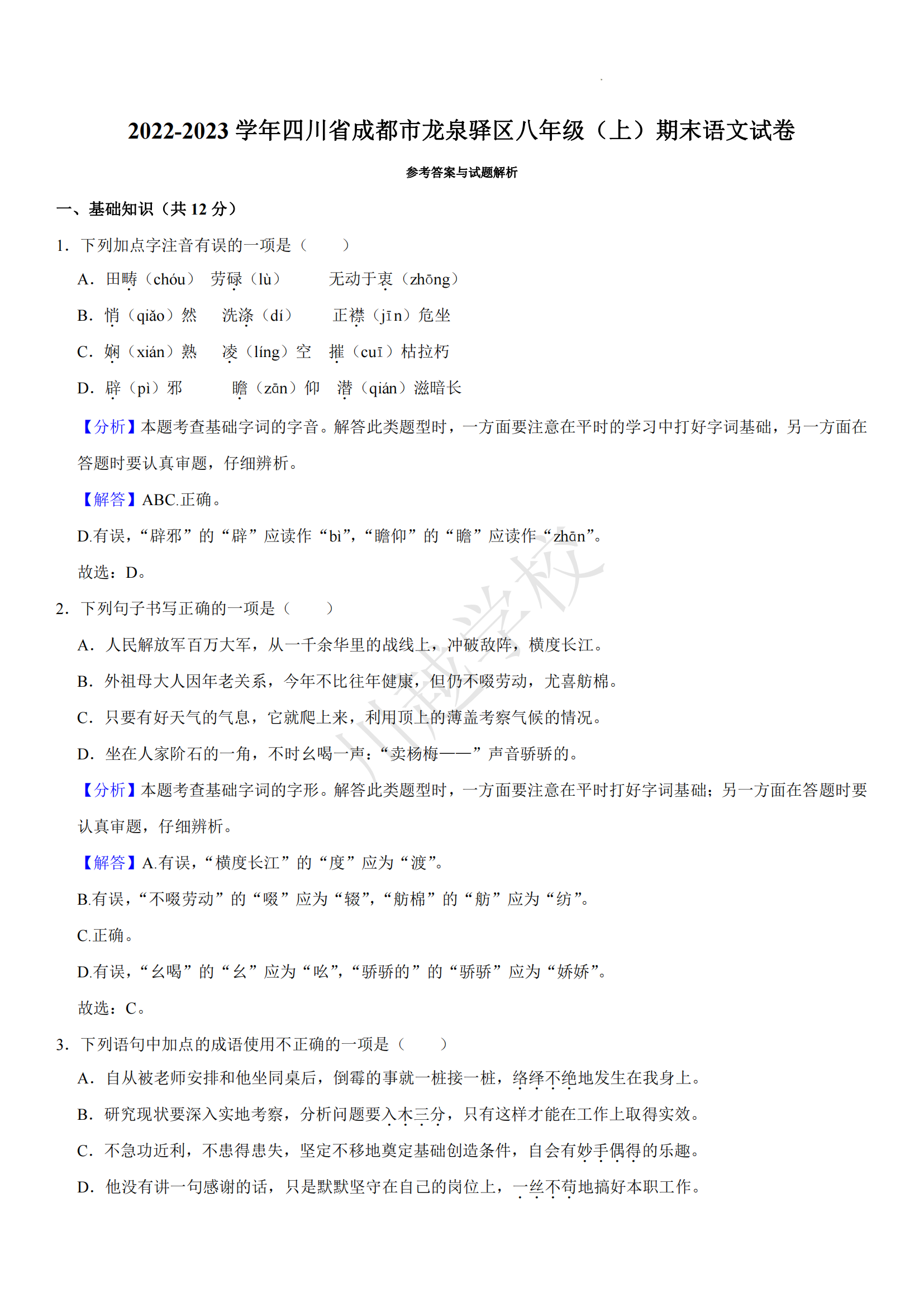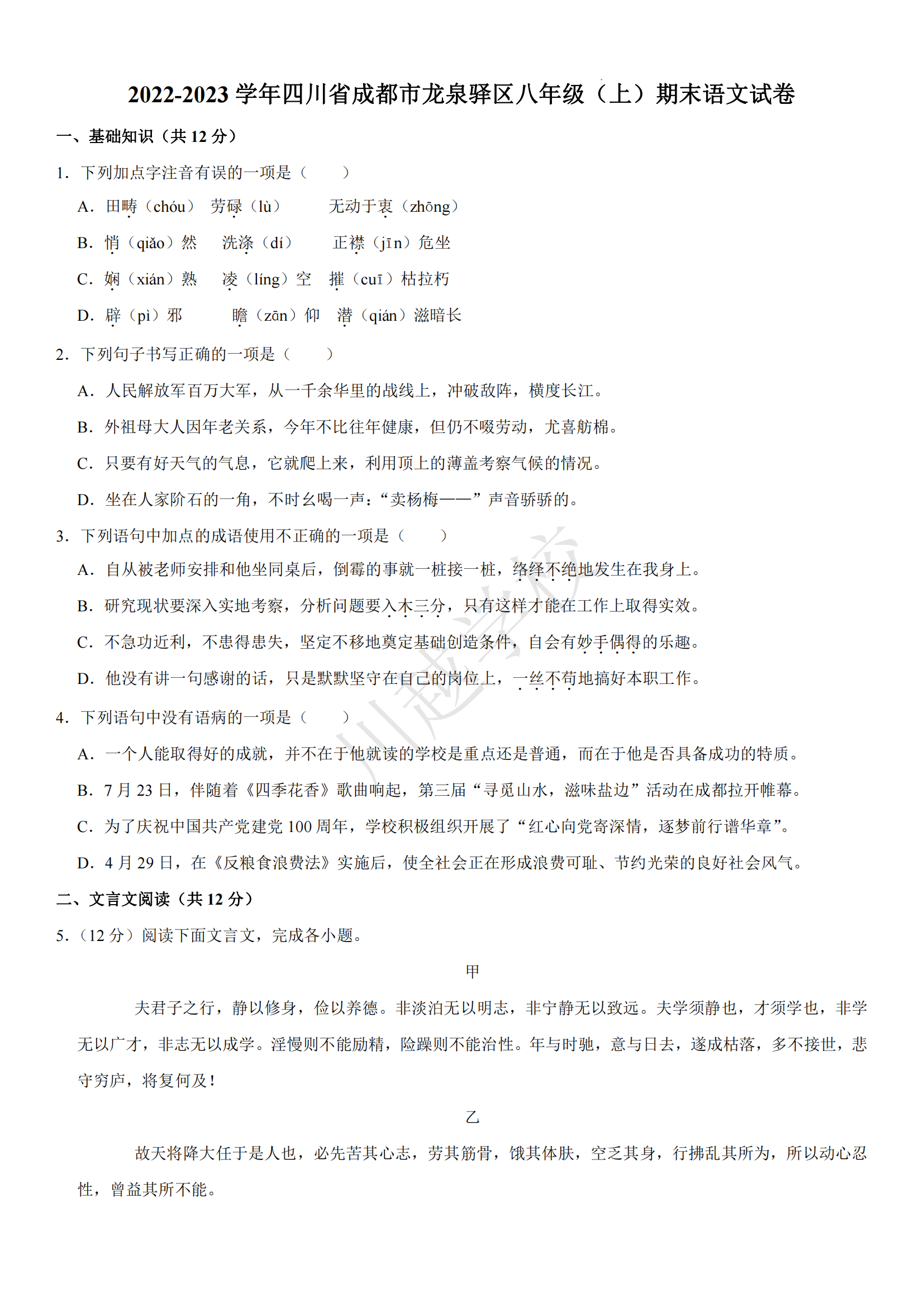 四川省成都市龍泉驛區(qū)2022-2023學(xué)年八年級(jí)上學(xué)期期末考試語(yǔ)文試卷