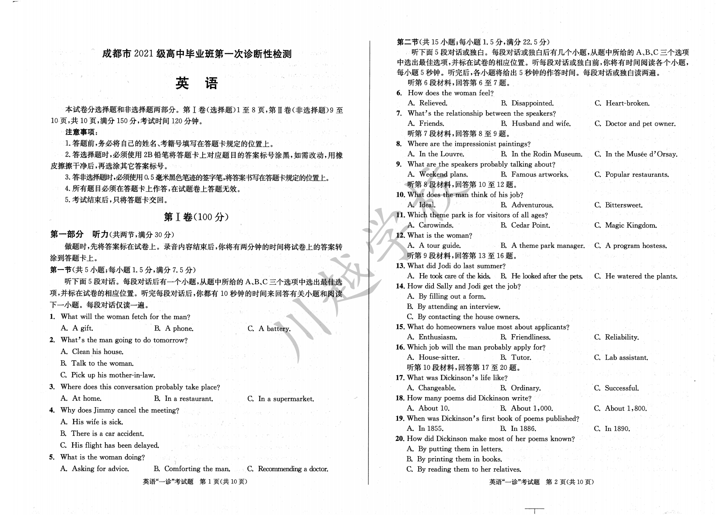 成都市2024年畢業(yè)班第一次診斷性檢測