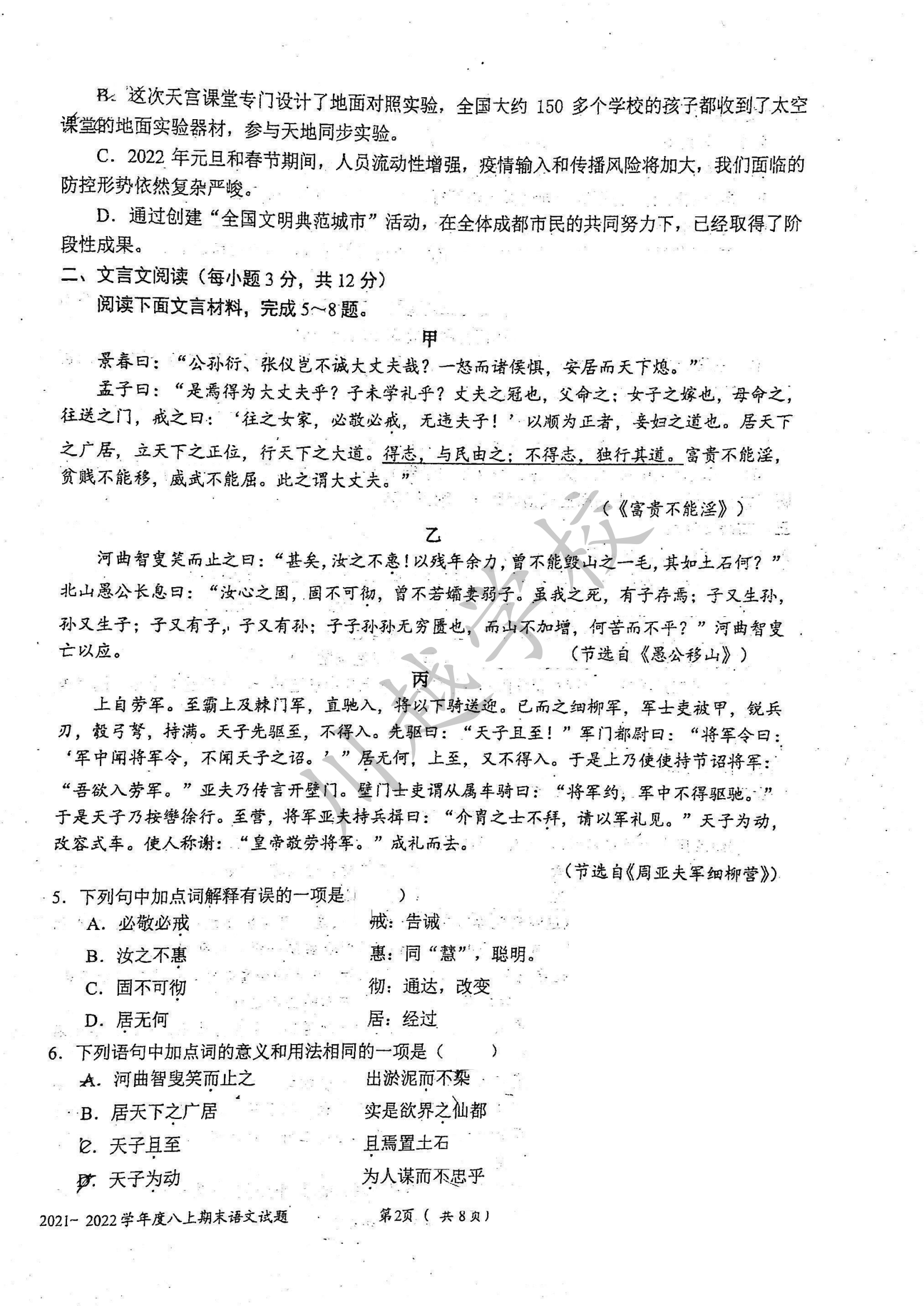 2024-02-01 | 文章來源:四川省成都市青羊區(qū)石室聯(lián)合中學2021-2022學年八年級上學期期末語文試題 | 分享到: