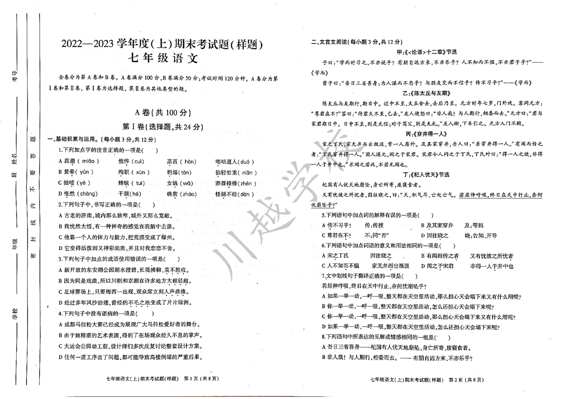 四川省成都市金牛區(qū)2022-2023學(xué)年七年級(jí)上學(xué)期期末語(yǔ)文試題