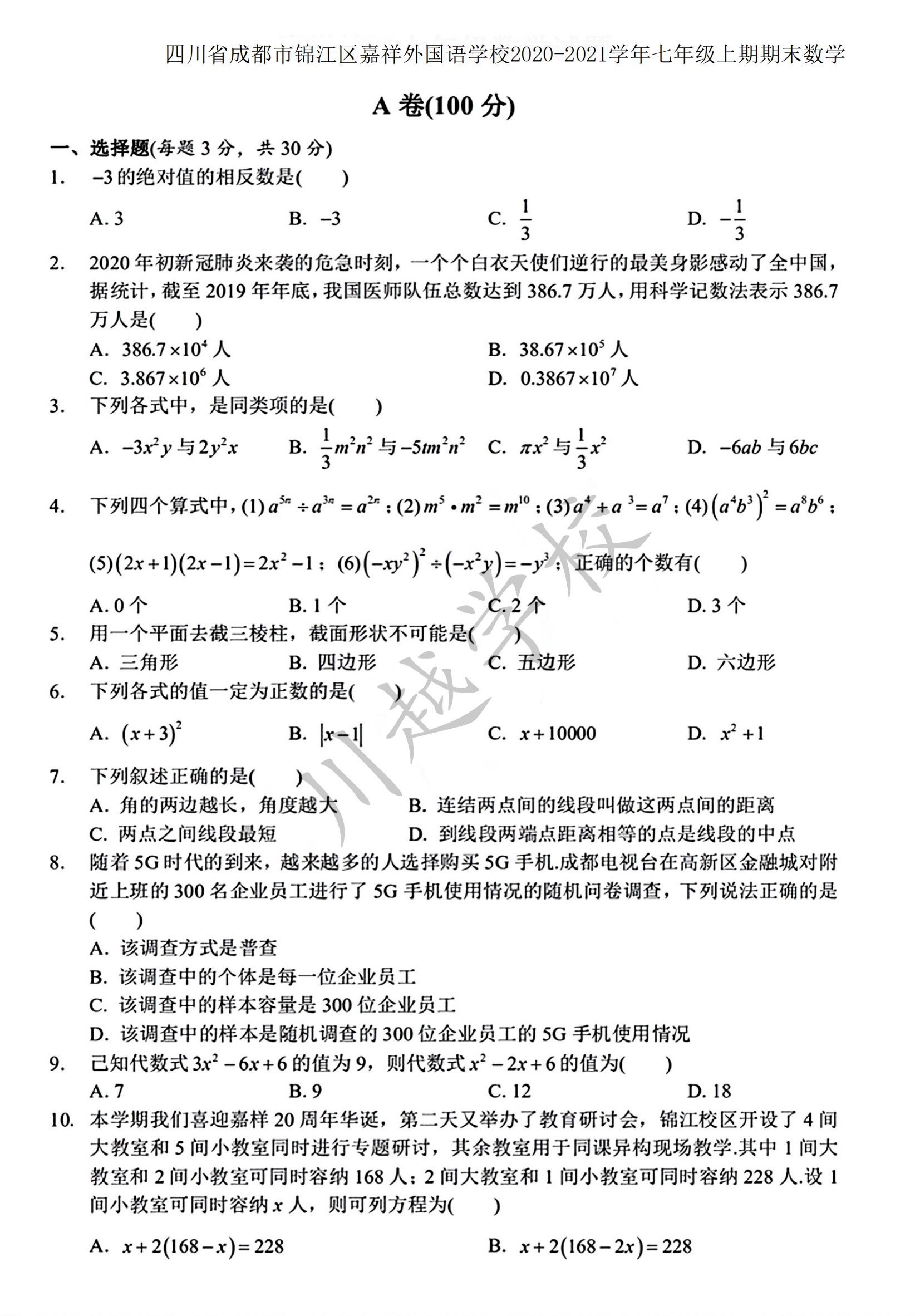 四川省成都市錦江區(qū)嘉祥外國語學校2020-2021學年七年級上期期末數(shù)學試題