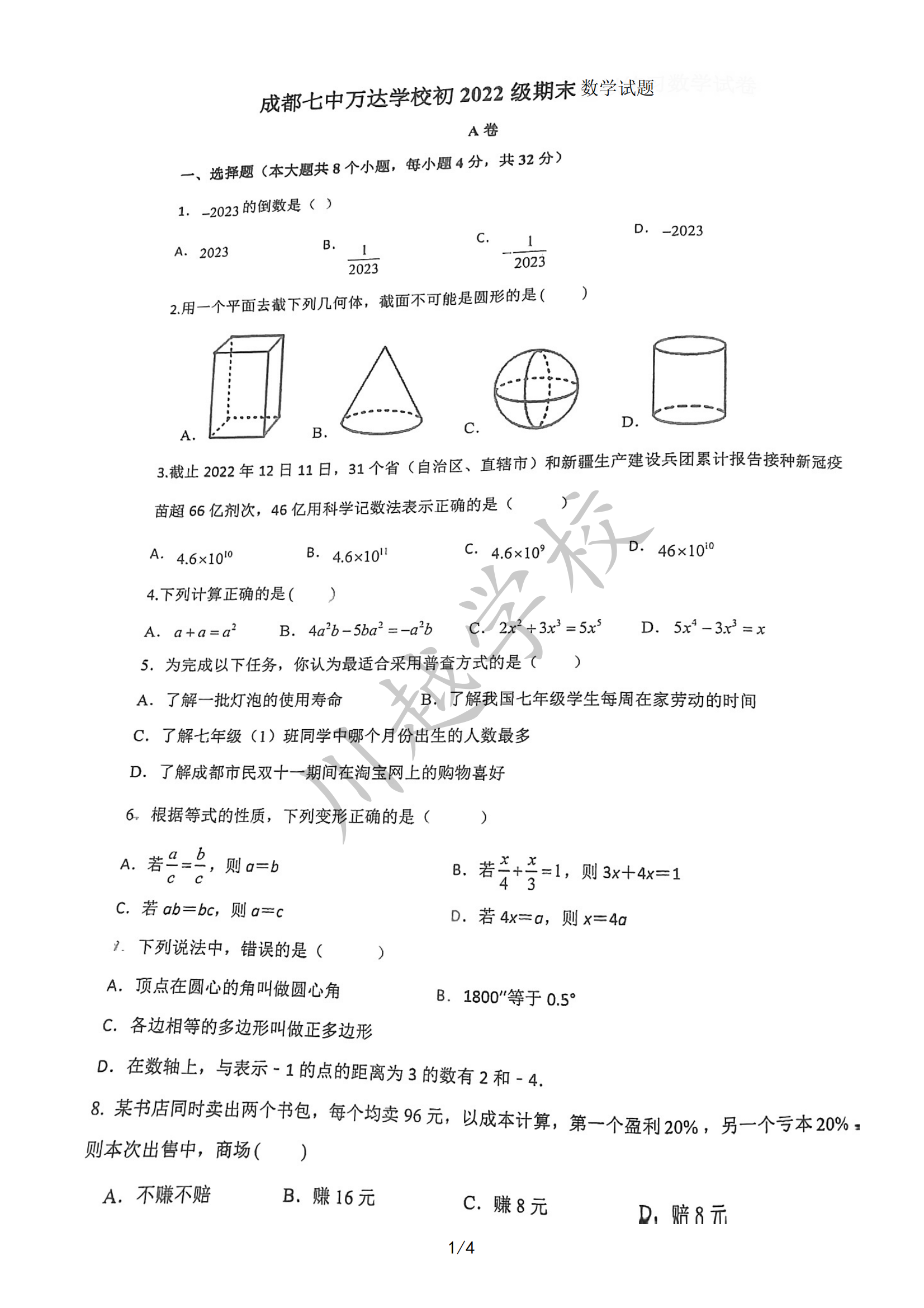 四川省成都市七中萬達(dá)學(xué)校2022—2023學(xué)年七年級上學(xué)期期末數(shù)學(xué)試題