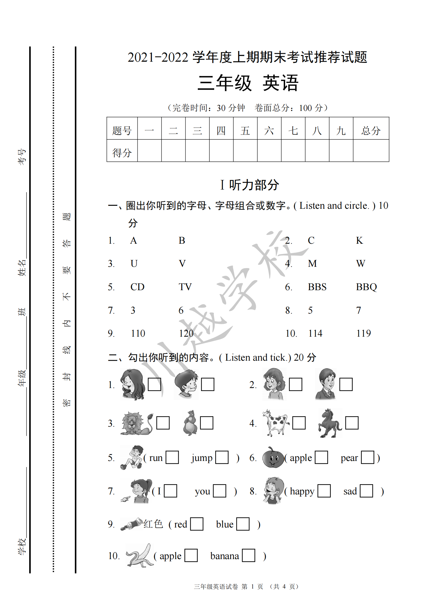 2021-2022學年度上期期末考試推薦試題 三年級英語試題