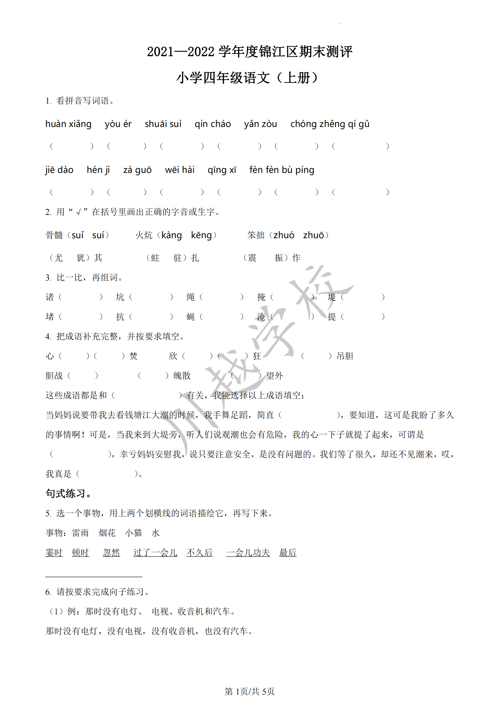 2021-2022學年四川省成都市錦江區(qū)部編版四年級上冊期末學業(yè)質量監(jiān)測語文試卷(原卷版)