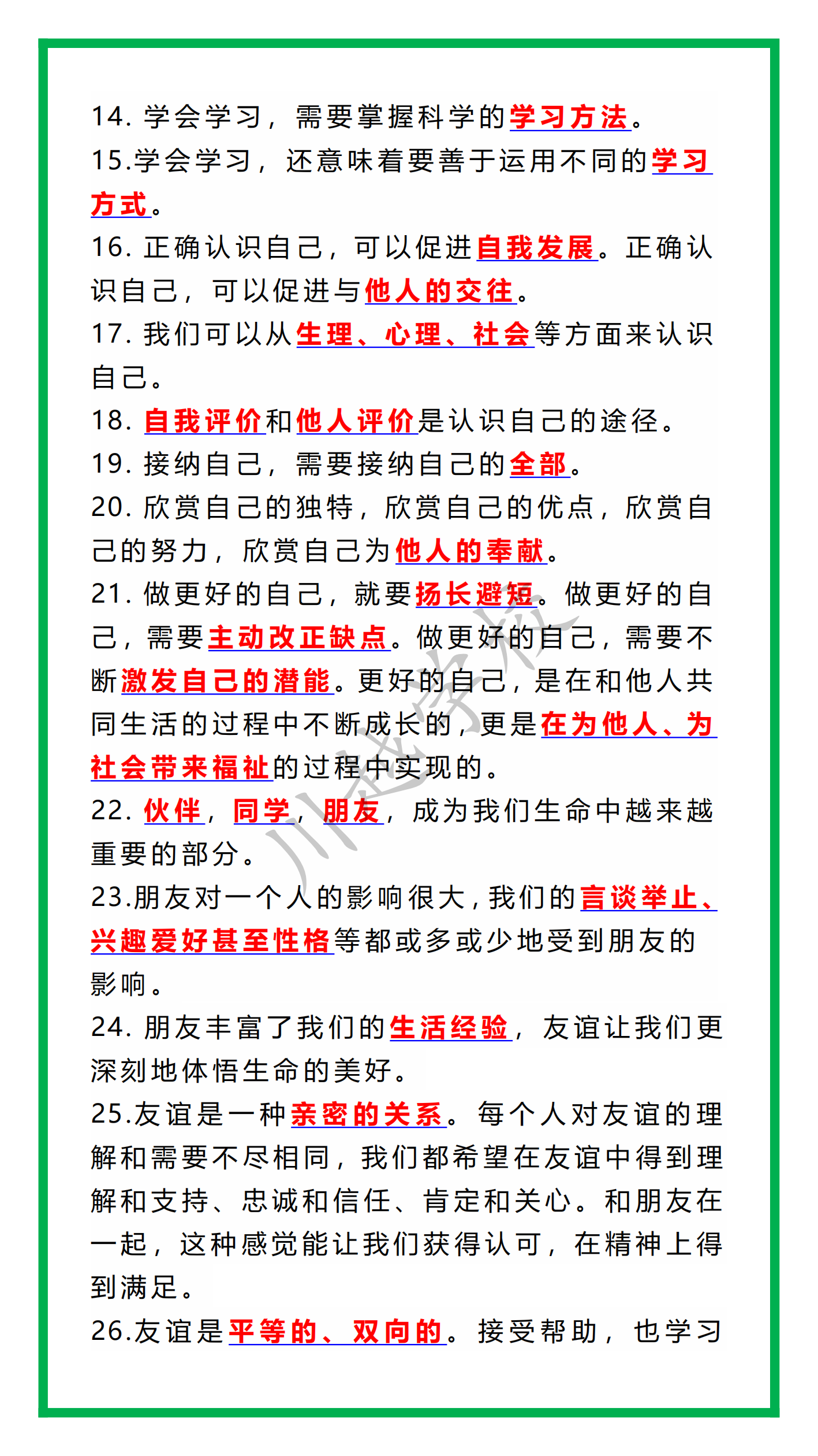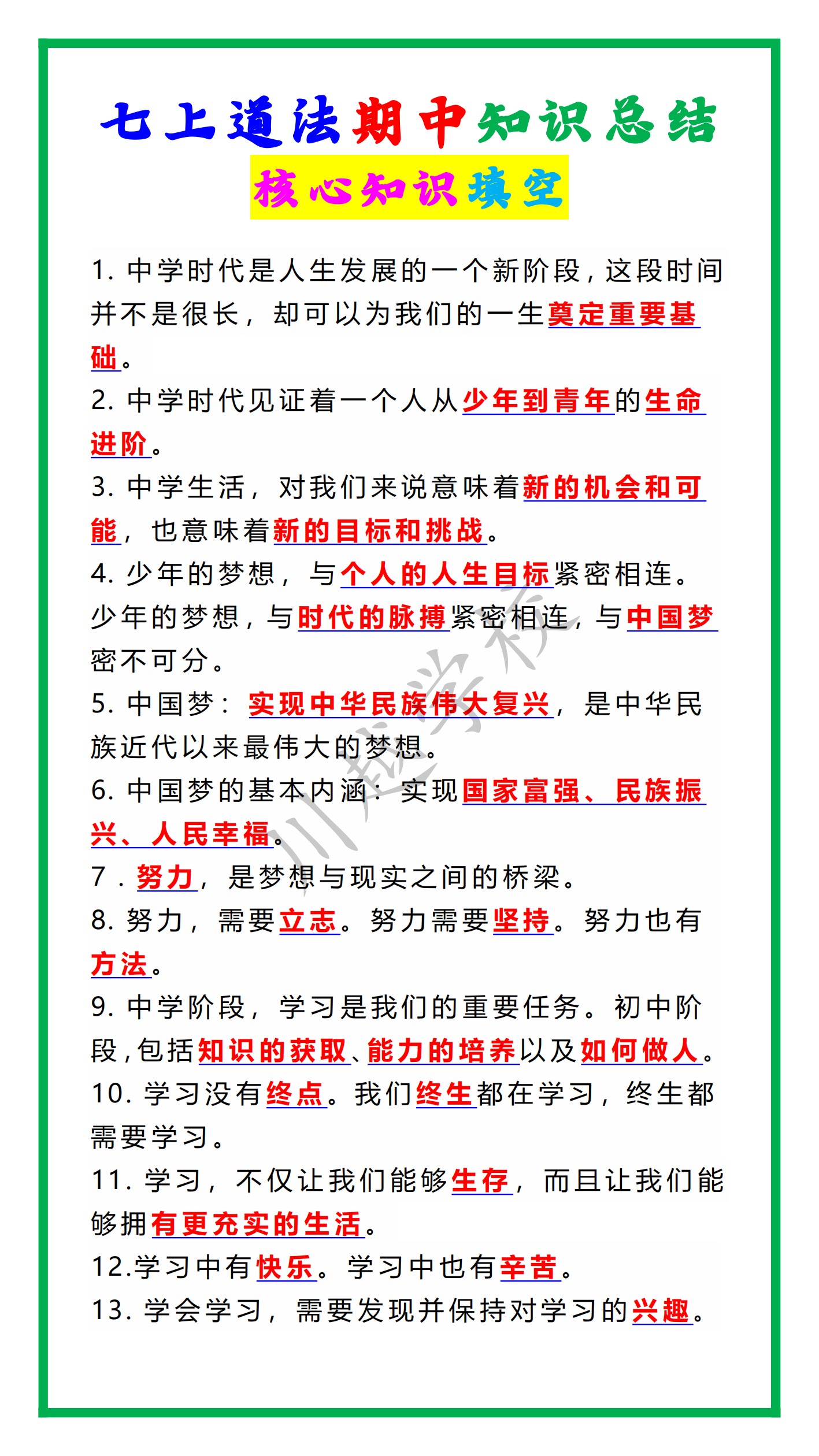 1初一道法上冊(cè)、核心知識(shí)填空、期中復(fù)習(xí)必備