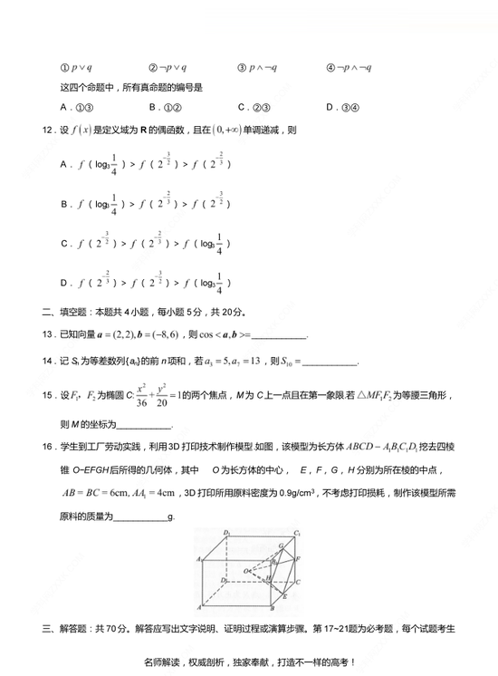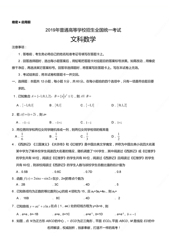 2019年高考文數(shù)真題及參考答案(全國(guó)卷Ⅲ)