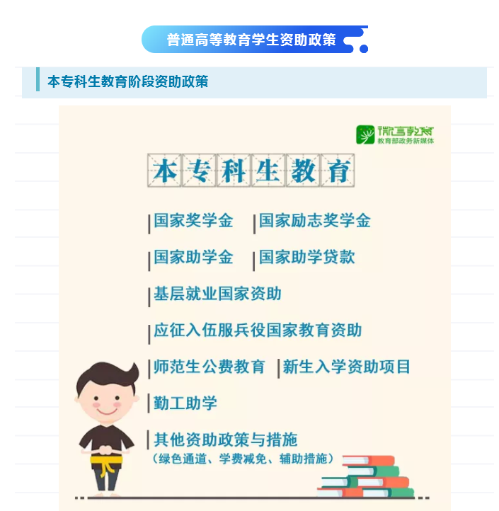 教育小微和大家念叨一下,咱們國家已經(jīng)建立起一套比較完善的、覆蓋學(xué)前教育至研究生教育的、具有中國特色的學(xué)生資助政策體系。今天,教育小微就帶大家了解一下,請(qǐng)注意查收↓↓↓