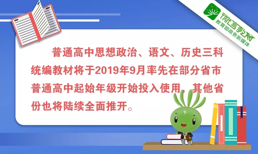 8月27日上午,教育部召開(kāi)新聞發(fā)布會(huì),介紹高中三科統(tǒng)編教材投入使用及義務(wù)教育三科統(tǒng)編教材全覆蓋工作情況。教育部組織編寫(xiě)的普通高中思想政治、語(yǔ)文、歷史教材,將于2019年9月率先在部分省市普通高中起始年級(jí)開(kāi)始投入使用,其他省份也將陸續(xù)全面推開(kāi)。