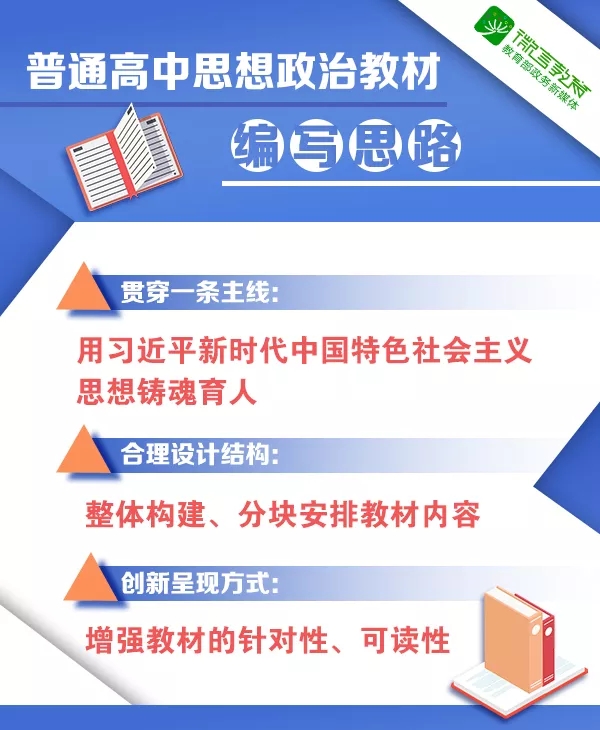 四是堅(jiān)持綜合協(xié)同。加強(qiáng)三科教材之間的橫向配合,發(fā)揮學(xué)科綜合育人作用。加強(qiáng)與義務(wù)教育教材的縱向銜接,實(shí)現(xiàn)主線貫穿、循序漸進(jìn)、螺旋上升。適應(yīng)普通高中育人模式和評(píng)價(jià)模式改革,創(chuàng)新教材編寫(xiě)設(shè)計(jì),把觀點(diǎn)、內(nèi)容、方法有機(jī)統(tǒng)一,突出教師的主導(dǎo)作用和學(xué)生的主體地位。