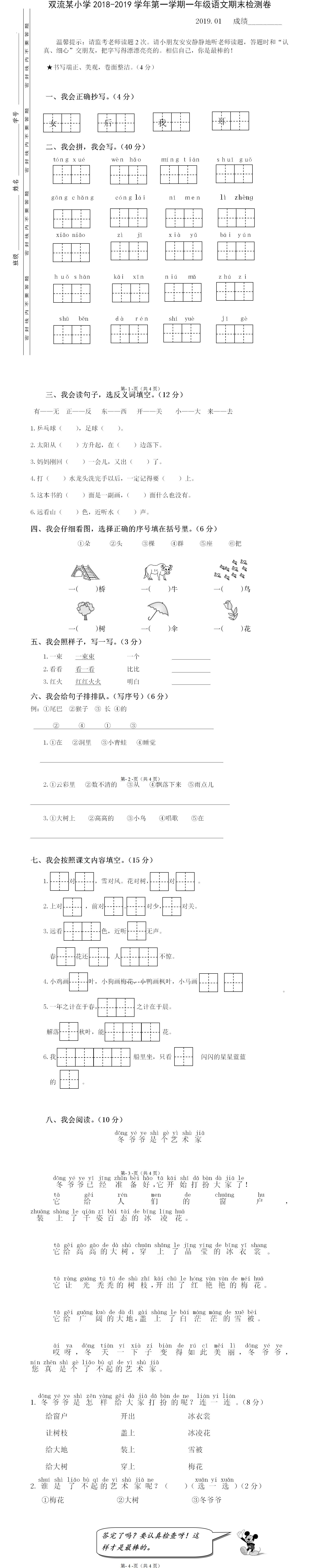 雙流某小學(xué)2018-2019學(xué)年第一學(xué)期一年級(jí)語文期末檢測卷