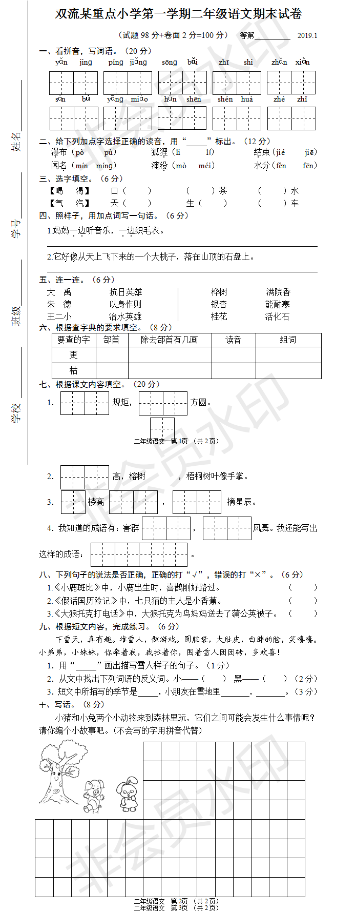 雙流某重點(diǎn)小學(xué)二年級上冊語文期末測試3