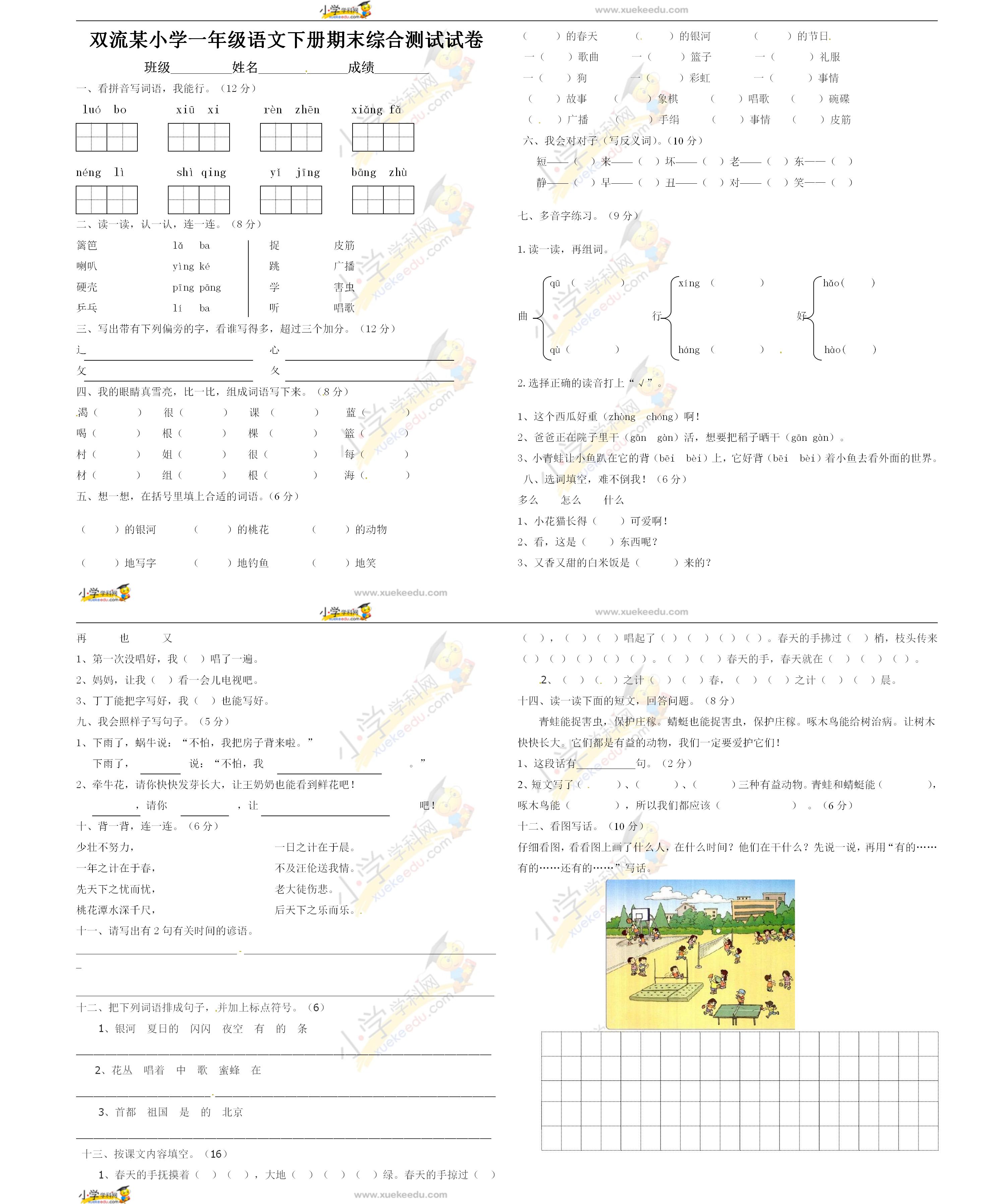 雙流某小學(xué)一年級(jí)語(yǔ)文下冊(cè)期末綜合測(cè)試試卷1