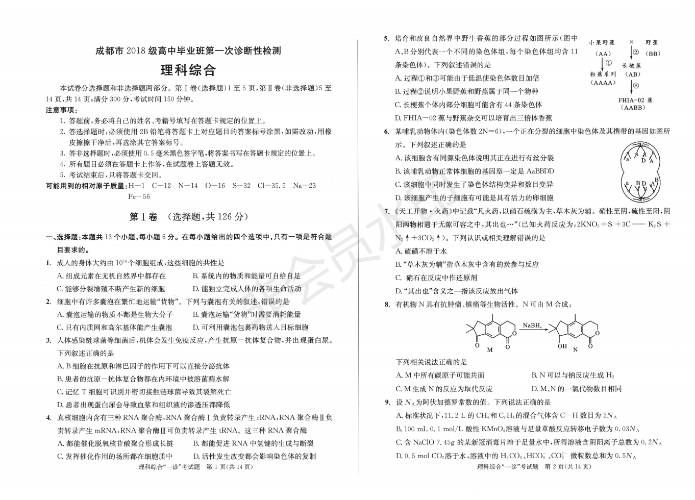 成都2021年高三一診理綜