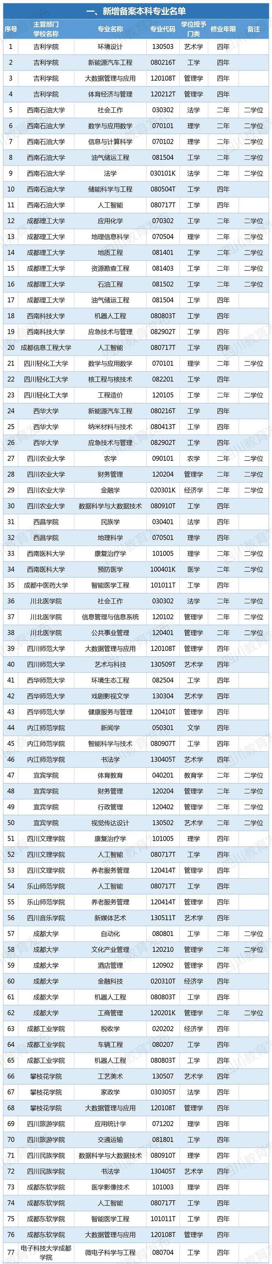 其中,四川新增備案本科專業(yè)110個(gè),新增審批本科專業(yè)4個(gè),調(diào)整學(xué)位授予門類或修業(yè)年限的專業(yè)1個(gè),撤銷本科專業(yè)17個(gè)。