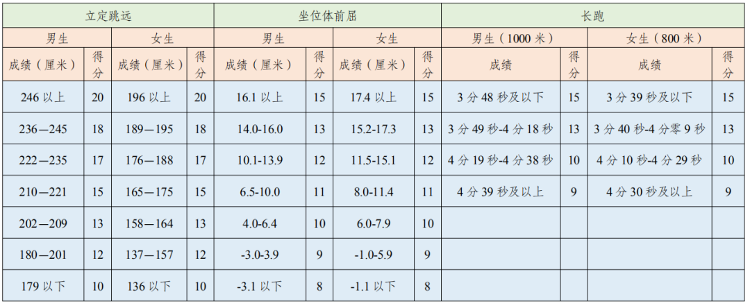 項(xiàng)目標(biāo)準(zhǔn)無變化今年中考體考項(xiàng)目分三項(xiàng),坐位體前屈(15分)、立定跳遠(yuǎn)(20分)、長跑(15分)都要進(jìn)行集中考試,分值50分,測試標(biāo)準(zhǔn)不變!由各區(qū)(市)縣進(jìn)行組織實(shí)施,于4月集中開展。