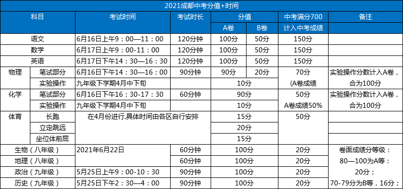 2021年成都中考時(shí)間定于6月16日、6月17日??荚嚌M分為700分。