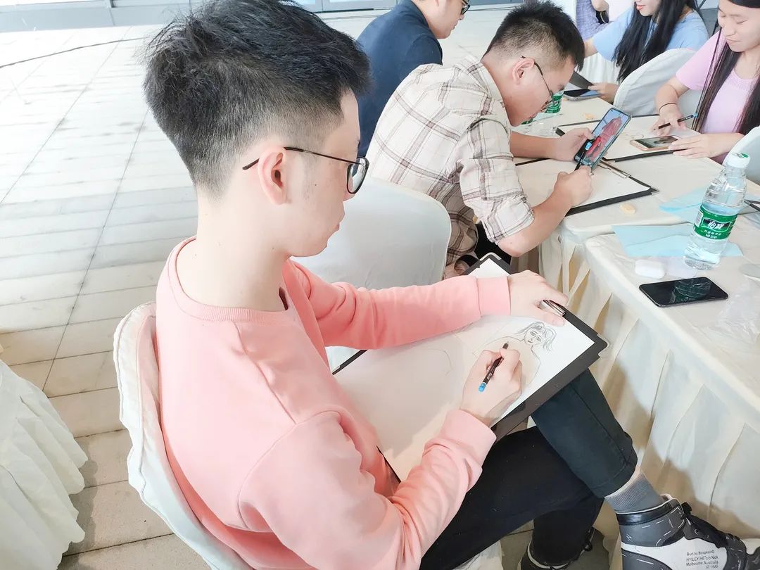 再來素描自畫像。在場的“油菜花”(有才華)們躍躍欲試,看這位小哥畫得專心致志~