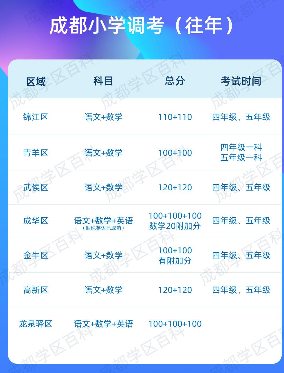 小學調考,全稱小學調研考試,又名“學業(yè)素質與能力評價測試”。成都市不統(tǒng)一安排調考,由各區(qū)自行安排是否調考、什么時候考、考試科目、科目分數(shù),并由各區(qū)自主命題。