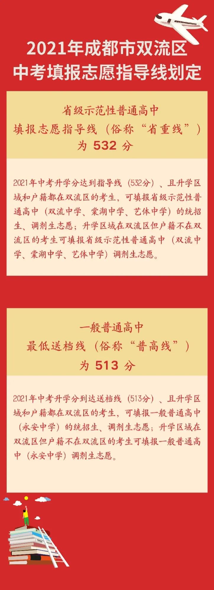 2021年成都市雙流區(qū)中考填報(bào)志愿指導(dǎo)線劃定,“省重線”為532分,“普高線”為513分。