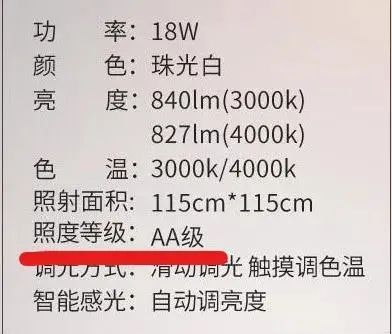 *讀寫臺燈的參數(shù)中會將照度和照度均勻度標(biāo)注為“照度等級”,照度等級分為“A”或“AA”級,區(qū)別在同等的照射區(qū)域內(nèi)“AA”級照度和照度均勻度更高。