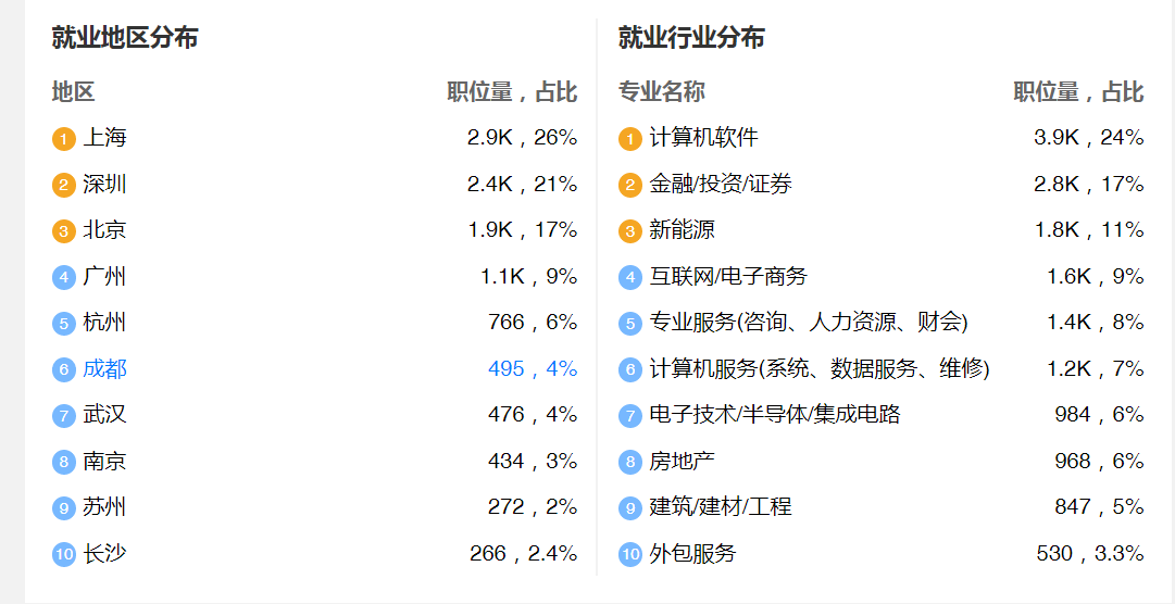 根據(jù)職友集近30天(截至2021年8月)15703份樣本進行得統(tǒng)計,金融工程專業(yè)需求量最多的地區(qū)是上海,占26%;金融工程專業(yè)需求量最多的行業(yè)是“計算機軟件”,占24%。排在前10位的就業(yè)地區(qū)分布和就業(yè)行業(yè)分布情況如下: